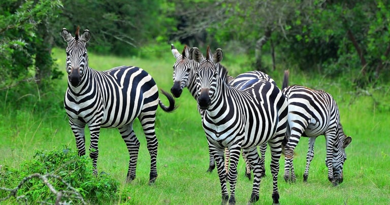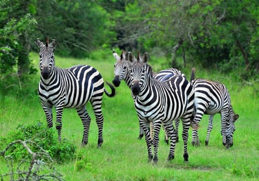Akagera National Park — savannah wildlife including elephants, lions, giraffes, and zebras